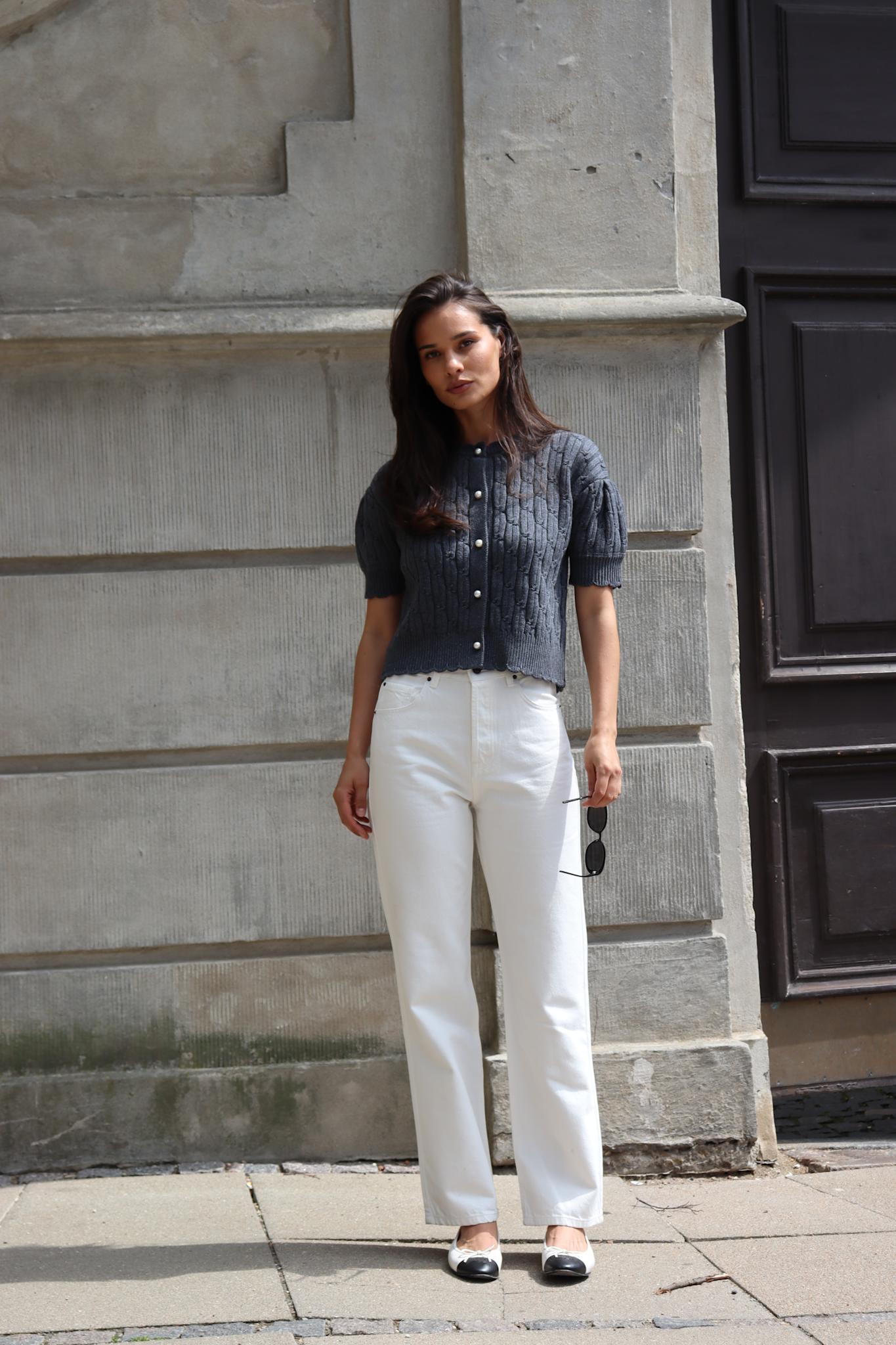 Noabelle er en smuk og feminin cardigan med korte ærmer, strikket i 100% uld. Den kraftige og faste kvalitet gør den ideel som varmende lag i overgangssæsoner. Cardiganen har en elegant bølget ribkant ved halsen, ærmeafslutningerne og forneden, som tilføjer blødhed og et feminint udtryk til den strukturerede strik. Det diskrete mønster i materialet giver cardiganen karakter og gør den til et stilfuldt valg til både hverdag og pænere anledninger. Noabelle Cardigan lukkes med fine perleknapper, der fuldender det sofistikerede look. Brug den over en kjole, med jeans eller som et let alternativ til en blazer.