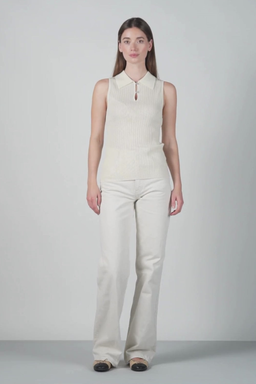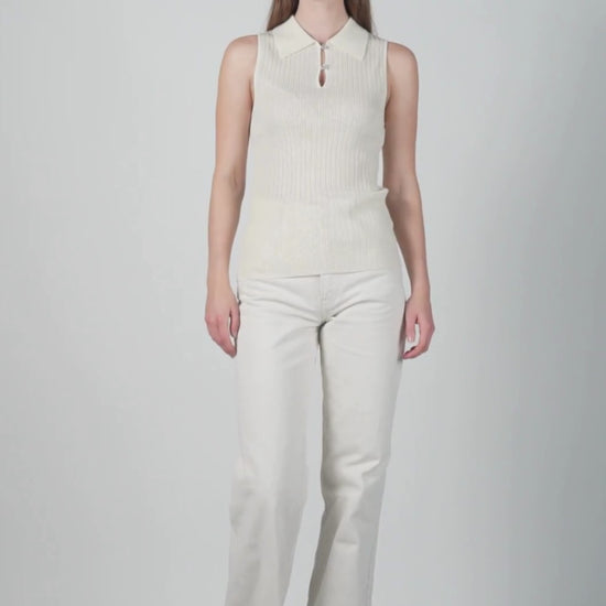 Maddie Top er en stilfuld, ærmeløs top med en fin krave, der tilføjer et elegant touch. Den lukkes foran med to smukke knapper formet som O'TAY-logoet og dekoreret med similisten. Fremstillet i en luksuriøs blanding af 75% merino uld og 25% silke, er Maddie Top både blød og behagelig. Perfekt som et elegant statement.