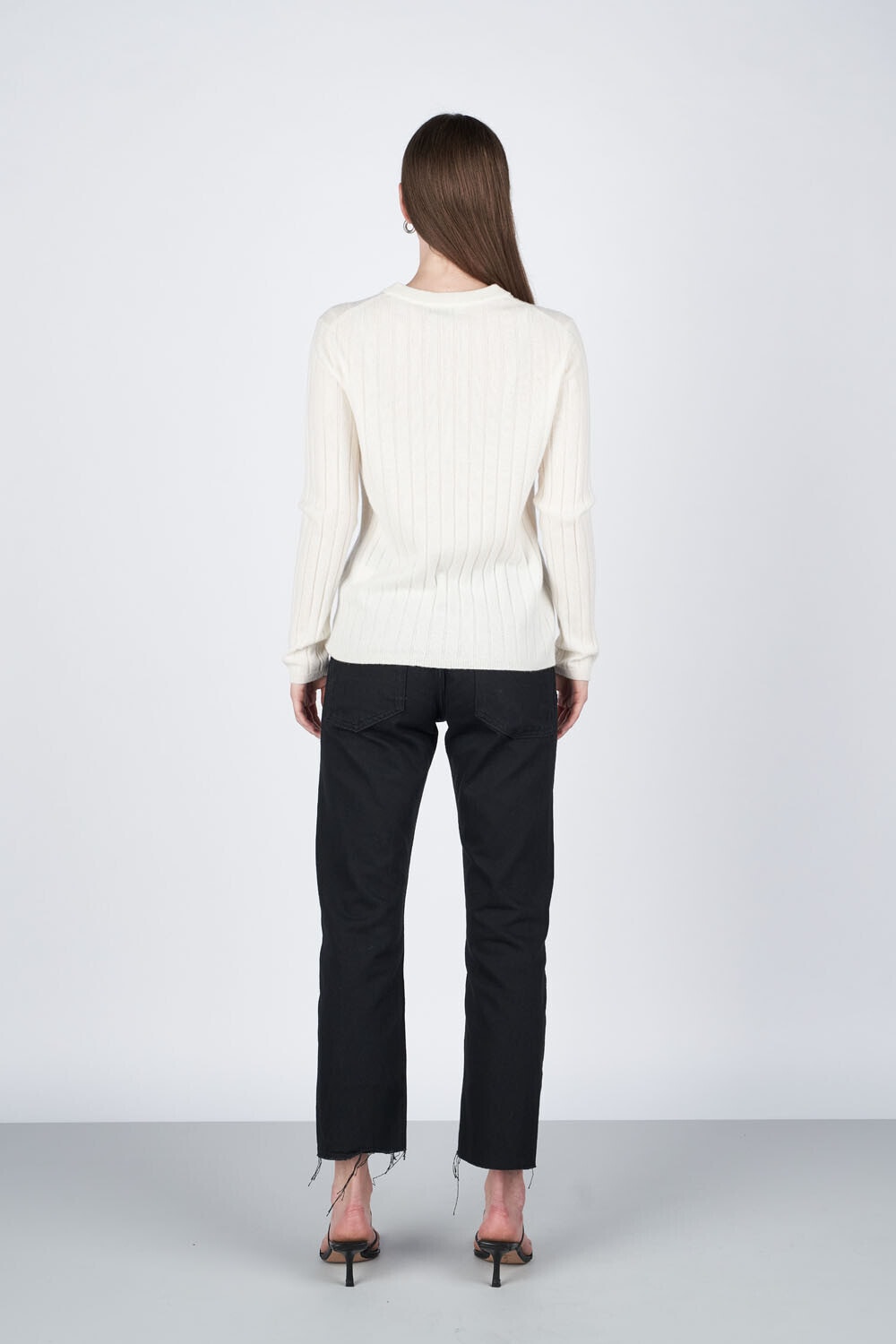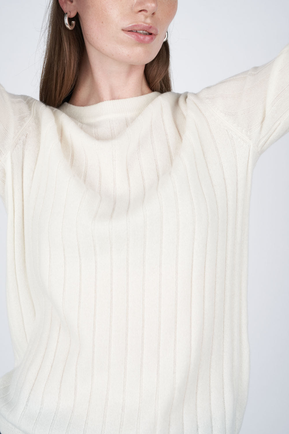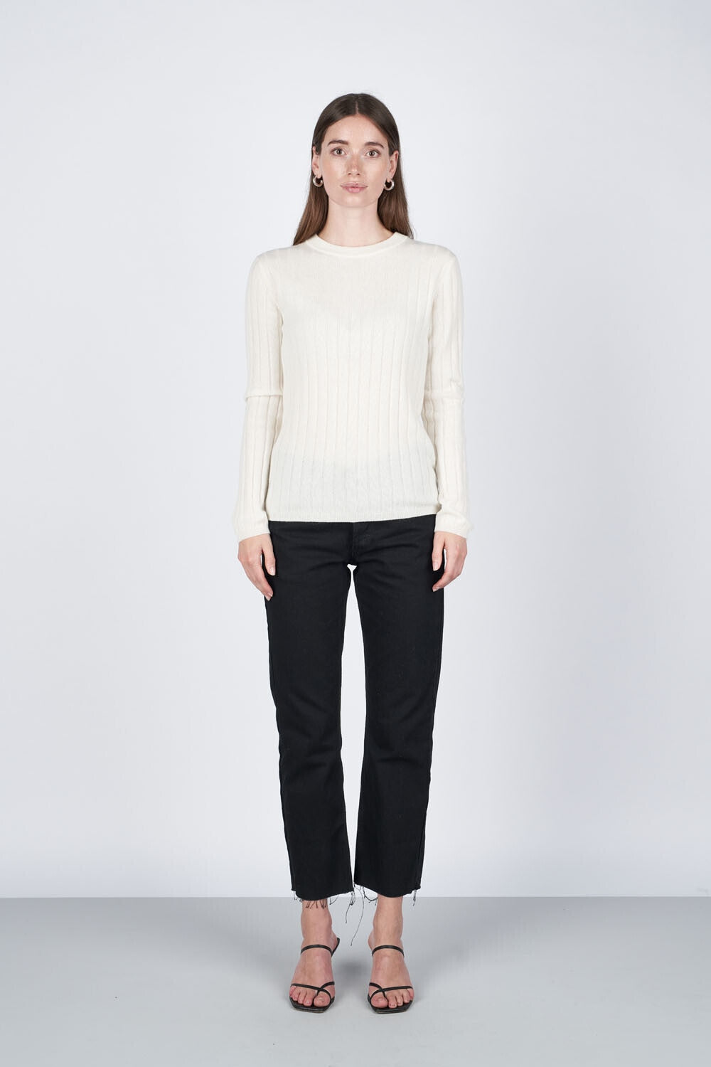100% cashmere sweater i bred ribstrik med rundhals. En tætsiddende model. Anna bliver din nye yndlingsbasic i garderoben. Hvis du ikke ønsker et tætsiddende look, kan du med fordel gå en størrelse op. Super fin og nem strik at style under en oversize blazer. Kan både bruges til hverdag og fest.
