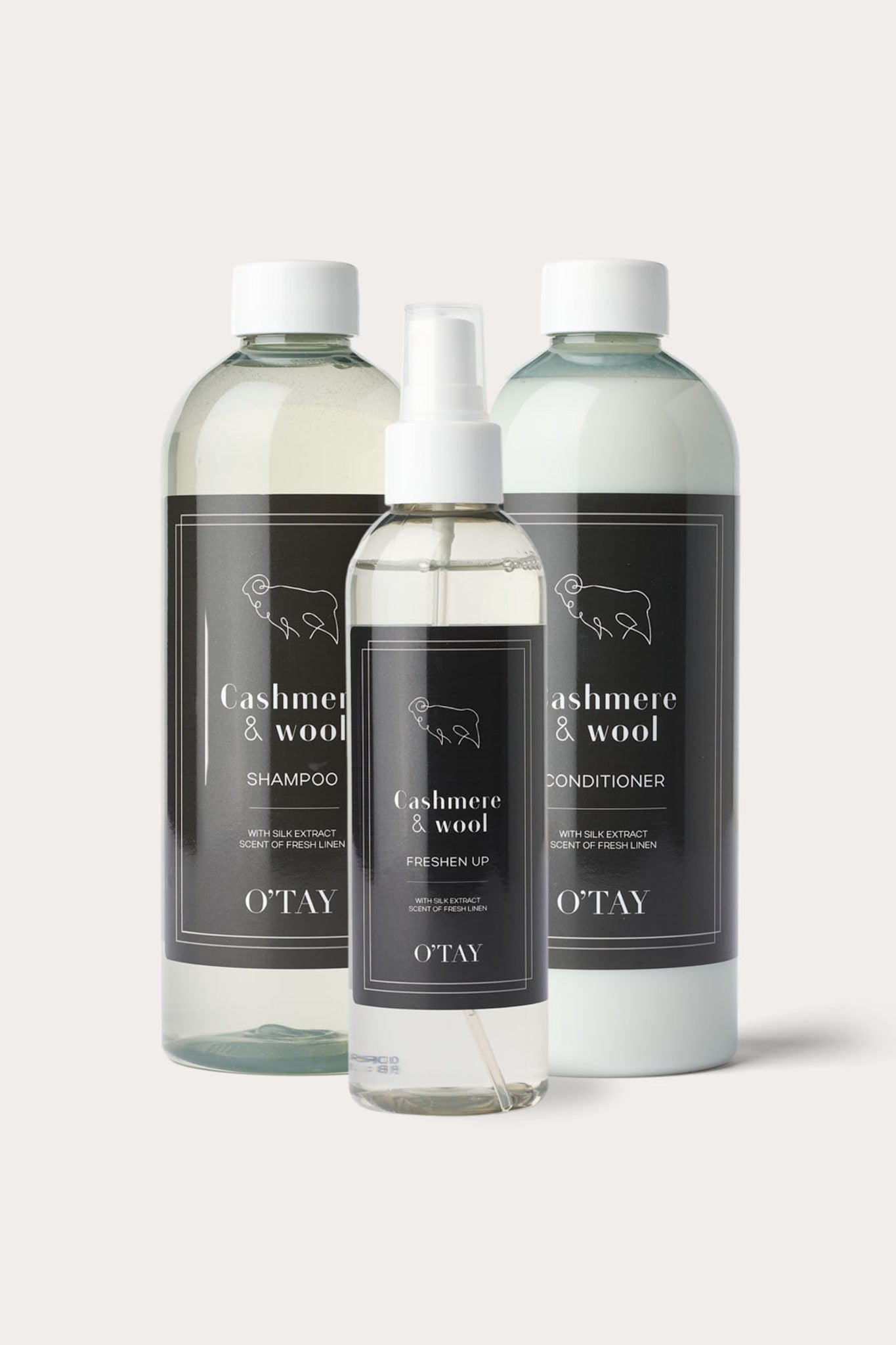 Oplev den ultimative luksuspleje til dine cashmere- og uldprodukter med O'TAY Care Set - Big. Dette komplette sæt indeholder Cashmere Shampoo, Cashmere Conditioner og Freshen Up Spray – alt hvad du behøver for at holde dine favoritstrik bløde, velduftende og velplejede. Shampooen renser skånsomt, conditioneren genopretter fibrenes naturlige blødhed, og Freshen Up Sprayen giver dit tøj et øjeblikkeligt frisk pust mellem vaskene. Det perfekte sæt til dig, der vil give dine luksusmaterialer den allerbedste behandling.