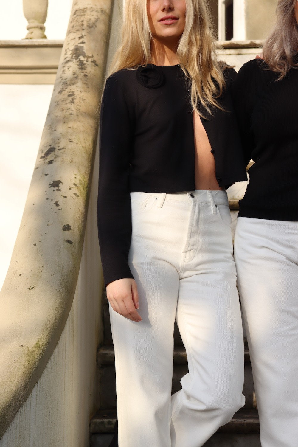 Ginny Cardigan er en lettere cropped cardigan med fine blanke knapper. Ginny har en fin detalje med en blomst på brystet. En super feminin og klassisk style, som vil pifte ethvert outfit op.