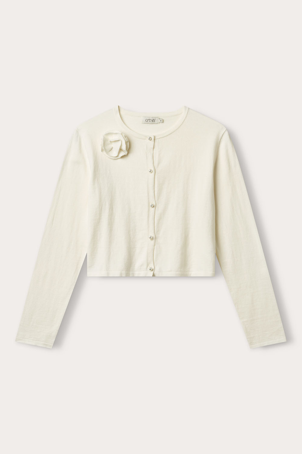 Ginny Cardigan er en lettere cropped cardigan med fine blanke knapper. Ginny har en fin detalje med en blomst på brystet. En super feminin og klassisk style, som vil pifte ethvert outfit op.