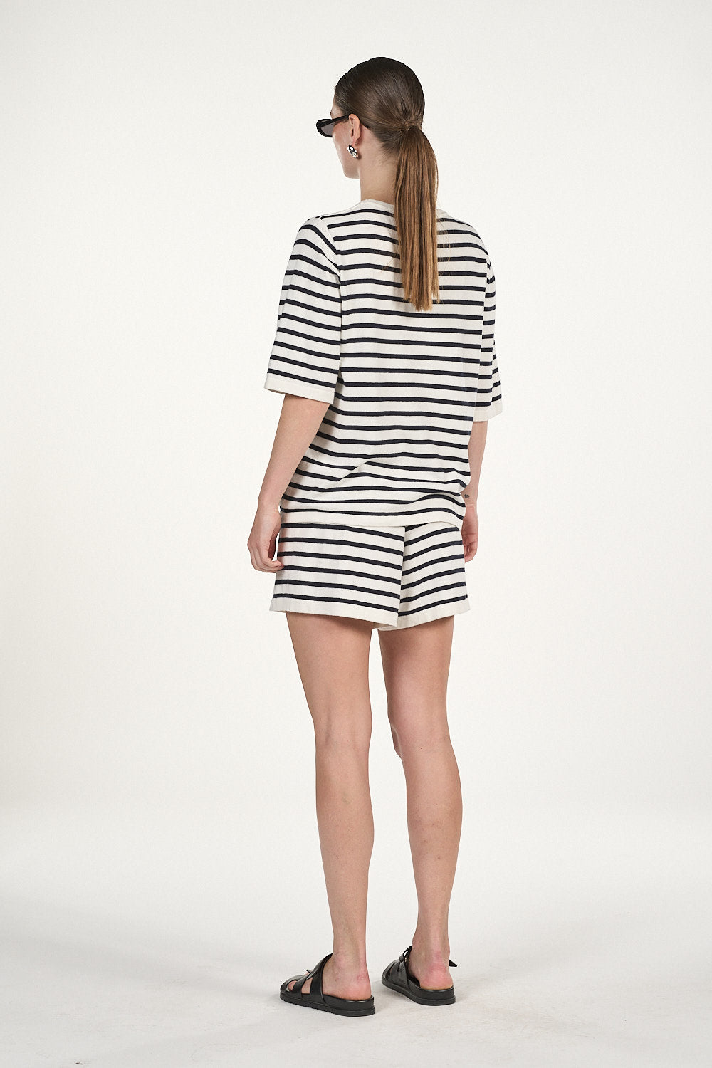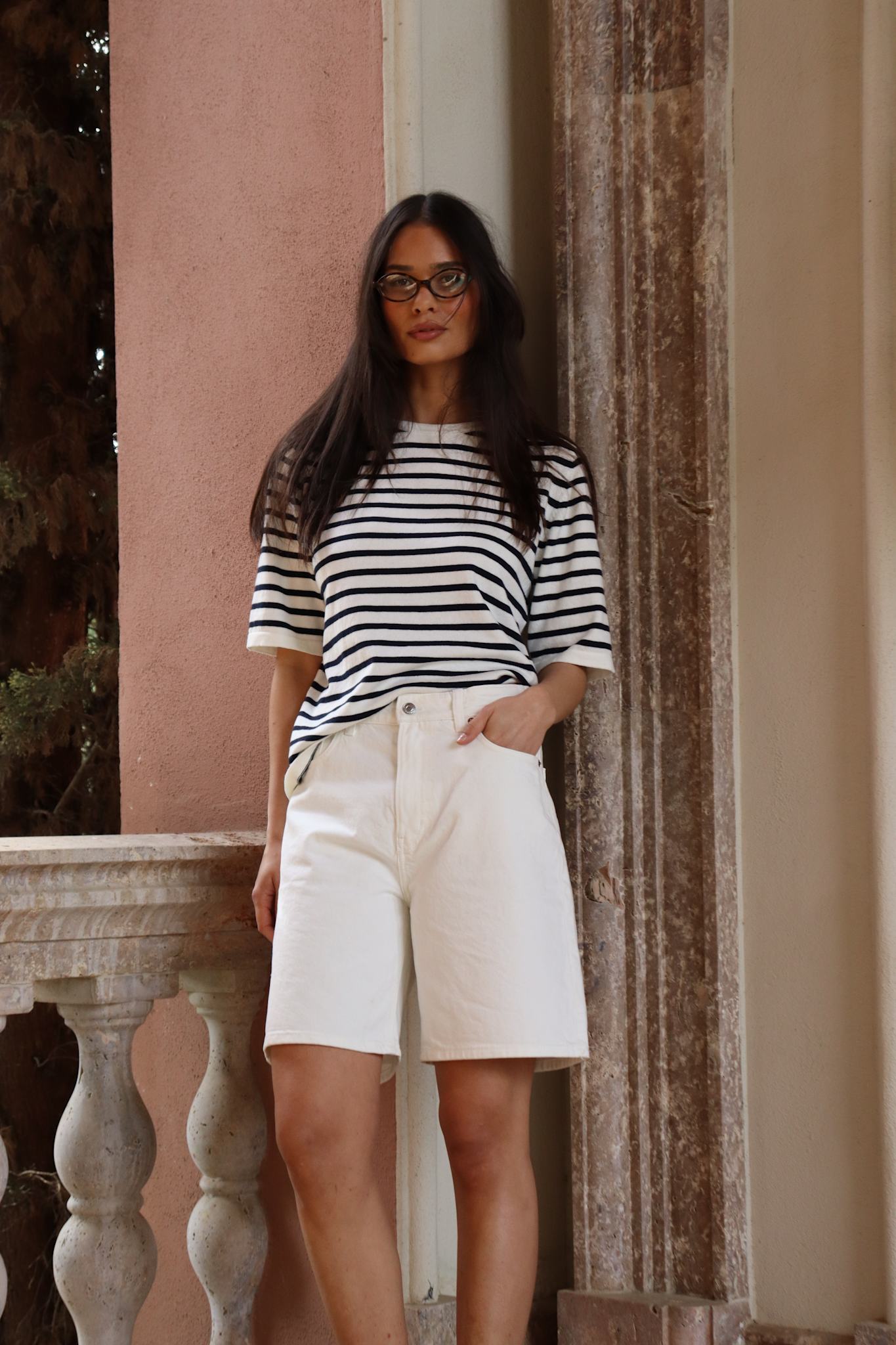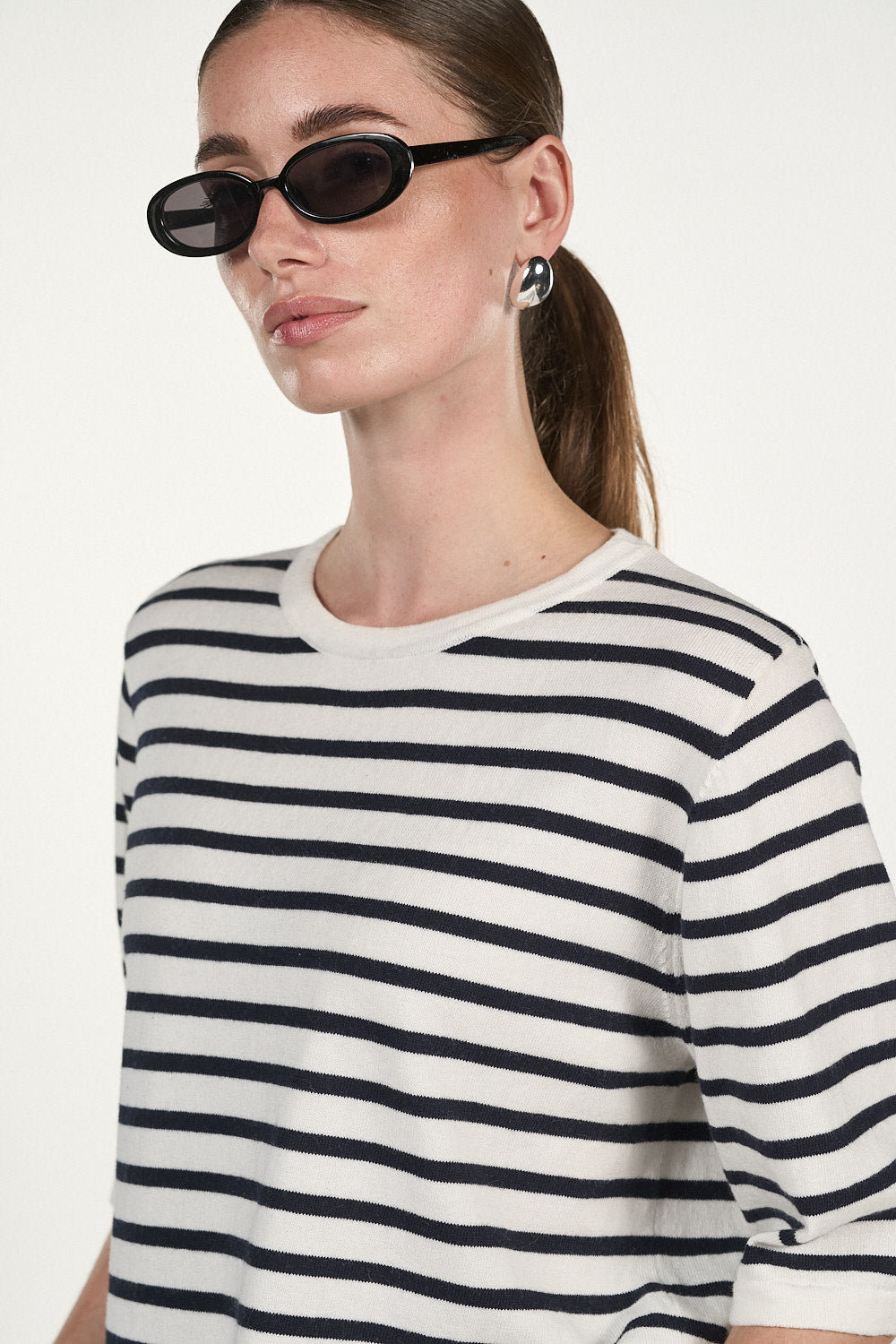 Gå igennem sommeren med vores fine Gurli T-shirt. Den tynde strik med fine hvide og navy striber består af 5% cashmere og 95% bomuld. Med lidt længere t-shirt-ærmer og en elegant pasform er den perfekt til de varme dage. Kom i sommerstemning med vores Gurli T-shirt ved at kombinere den med vores Galina Pants eller et par cowboy shorts for et mere afslappet look.