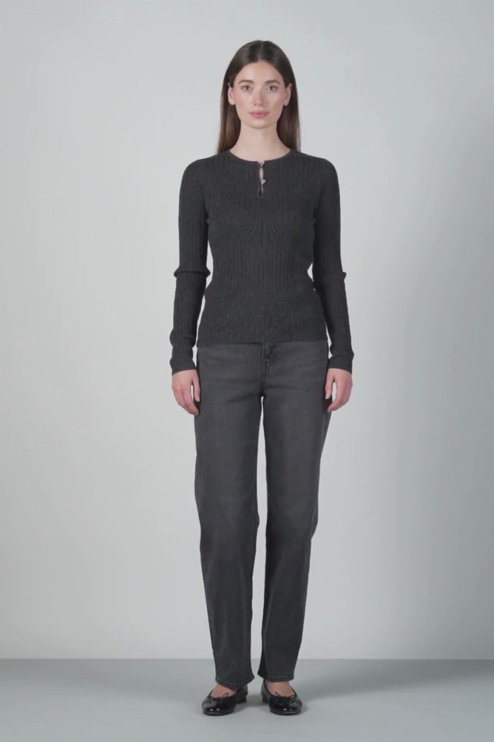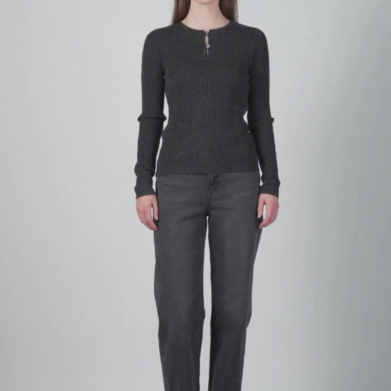 Megan Blouse er en langærmet bluse i ribstrik, fremstillet af en luksuriøs blanding af 75% merino uld og 25% silke, som giver en blød og let fornemmelse. Blusen lukkes foran med to smukke knapper formet som O'TAY-logoet og dekoreret med similisten, der tilføjer et strejf af glamour. Perfekt til både afslappede og elegante outfits, er Megan Blouse en tidløs tilføjelse til enhver garderobe.